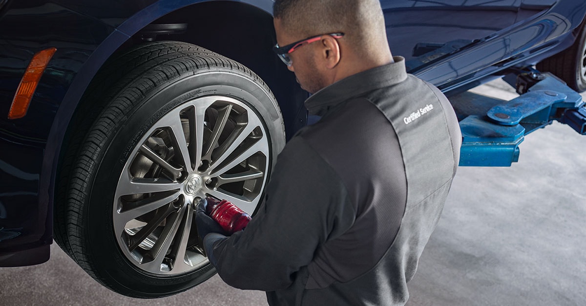 Your Buick tires will need a few different types of service at different times. Typically, you want to get the pressure checked at least once a month, especially if you are about to drive long distances or if the temperature has changed drastically. You also want to schedule tire rotations, which help to keep the tires wearing down evenly and let you know if there is an issue with the vehicle's alignment. Additionally, your tires should be replaced no less than every six years for the safest possible driving.