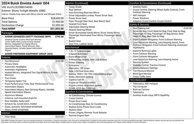 Powered by the efficient ECOTEC 1.2L Turbo engine and paired with a 6-Speed Automatic transmission, the 2024 Buick Envista Avenir delivers an impressive fuel economy of 28 city / 32 highway MPG, ensuring you can enjoy the open road with confidence.