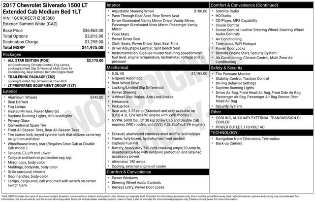 110-Volt AC Power Outlet, 150 Amp Alternator, 4.2 Diagonal Color Display Driver Info Center, 6 Speaker Audio System, All Star Edition, Bluetooth® For Phone, Body Color Bodyside Moldings, Body-Color Door Handles, Body-Color Mirror Caps, Body-Color Power Adjustable Heated Outside Mirrors, Chrome Grille Surround, Color-Keyed Carpeting w/Rubberized Vinyl Floor Mats, Deep-Tinted Glass, Driver & Front Passenger Illuminated Vanity Mirrors, Dual-Zone Automatic Climate Control, Electric Rear-Window Defogger, EZ Lift & Lower Tailgate, Front Chrome Bumper, HD Radio, Leather Wrapped Steering Wheel w/Cruise Controls, Manual Tilt Wheel Steering Column, OnStar 3 Months Guidance Plan, OnStar w/4G LTE, Power Windows w/Driver Express Up, Preferred Equipment Group 1LT, Rear 60/40 Folding Bench Seat (Folds Up), Rear Chrome Bumper, Rear Vision Camera, Rear Wheelhouse Liners, Remote Keyless Entry, Remote Locking Tailgate, Remote Vehicle Starter System, Single Slot CD/MP3 Player, Steering Wheel Audio Controls, Thin Profile LED Fog Lamps, Trailering Package, 10-Way Power Driver's Seat Adjuster, 4-Wheel Disc Brakes, 40/20/40 Front Split Bench Seat, 6 Speakers, ABS brakes, Air Conditioning, Alloy wheels, AM/FM radio: SiriusXM, Auxiliary External Transmission Oil Cooler, Bodyside moldings, Brake assist, Bumpers: chrome, CD player, Cloth Seat Trim, Compass, Delay-off headlights, Driver door bin, Driver vanity mirror, Dual front impact airbags, Dual front side impact airbags, Electronic Stability Control, Emergency communication system: OnStar Guidance, Exterior Parking Camera Rear, Front anti-roll bar, Front Center Armrest w/Storage, Front reading lights, Front wheel independent suspension, Fully automatic headlights, Heated door mirrors, Heavy Duty Suspension, Heavy-Duty Rear Locking Differential, High-Intensity Discharge Headlights, Illuminated entry, Low tire pressure warning, Manual Tilt/Telescoping Steering Column, Occupant sensing airbag, Outside temperature display, Overhead airbag, Overhead console, Panic alarm, Passenger door bin, Passenger vanity mirror, Power door mirrors, Power steering, Power windows, Premium audio system: Chevrolet MyLink, Radio data system, Radio: AM/FM 8 Diagonal Color Touch Screen, Rear reading lights, Rear step bumper, Remote keyless entry, SiriusXM Satellite Radio, Speed control, Speed-sensing steering, Split folding rear seat, Steering wheel mounted audio controls, Tachometer, Theft Deterrent System (Unauthorized Entry), Tilt steering wheel, Traction control, Trip computer, Variably intermittent wipers, Voltmeter, Wheels: 17 x 8 Bright Machined Aluminum, Wheels: 18 x 8.5 Bright-Machined Aluminum, 110-Volt AC Power Outlet, 150 Amp Alternator, 4.2 Diagonal Color Display Driver Info Center, 6 Speaker Audio System, All Star Edition, Bluetooth® For Phone, Body Color Bodyside Moldings, Body-Color Door Handles, Body-Color Mirror Caps, Body-Color Power Adjustable Heated Outside Mirrors, Chrome Grille Surround, Color-Keyed Carpeting w/Rubberized Vinyl Floor Mats, Deep-Tinted Glass, Driver & Front Passenger Illuminated Vanity Mirrors, Dual-Zone Automatic Climate Control, Electric Rear-Window Defogger, EZ Lift & Lower Tailgate, Front Chrome Bumper, HD Radio, Leather Wrapped Steering Wheel w/Cruise Controls, Manual Tilt Wheel Steering Column, OnStar 3 Months Guidance Plan, OnStar w/4G LTE, Power Windows w/Driver Express Up, Preferred Equipment Group 1LT, Rear 60/40 Folding Bench Seat (Folds Up), Rear Chrome Bumper, Rear Vision Camera, Rear Wheelhouse Liners, Remote Keyless Entry, Remote Locking Tailgate, Remote Vehicle Starter System, Single Slot CD/MP3 Player, Steering Wheel Audio Controls, Thin Profile LED Fog Lamps, Trailering Package.