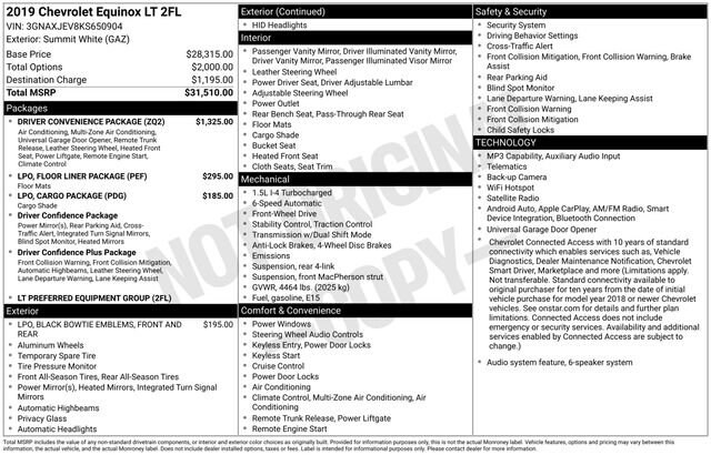 Apple CarPlay/Android Auto, Driver Confidence Package, Driver Confidence Plus Package, Preferred Equipment Group 2FL, Speed control, 17 Aluminum Wheels, 2 Rear USB Charging-Only Ports, 2 USB Ports & Auxiliary Input Jack, 2-Way Power Driver Lumbar Control Seat Adjuster, 3-Spoke Leather-Wrapped Steering Wheel, 3.50 Final Drive Axle Ratio, 4-Wheel Disc Brakes, 6 Speaker Audio System Feature, 6 Speakers, 8-Way Power Driver Seat Adjuster, ABS brakes, Air Conditioning, All-Weather Floor Liners (LPO), Alloy wheels, AM/FM radio: SiriusXM, Auto High-beam Headlights, Bluetooth® For Phone, Brake assist, Bumpers: body-color, Cargo Package (LPO), Compass, Delay-off headlights, Driver Convenience Package, Driver door bin, Driver vanity mirror, Dual front impact airbags, Dual front side impact airbags, Dual Zone Automatic Climate Control, Electronic Stability Control, Emergency communication system: OnStar and Chevrolet connected services capable, Floor Liner Package (LPO), Following Distance Indicator, Forward Collision Alert, Four wheel independent suspension, Front & Rear Black Bowtie Emblems (LPO), Front anti-roll bar, Front Bucket Seats, Front Center Armrest, Front Passenger 4-Way Manual Seat Adjuster, Front Pedestrian Braking, Front reading lights, Fully automatic headlights, Heated door mirrors, Heated Driver & Front Passenger Seats, High-Intensity Discharge Headlights, Illuminated entry, Integrated Cargo Liner (LPO), IntelliBeam Auto High Beam Headlamp Control, Lane Change Alert w/Side Blind Zone Alert, Lane Keep Assist w/Lane Departure Warning, Leather-Wrapped Shift Lever, Low Speed Forward Automatic Braking, Low tire pressure warning, Occupant sensing airbag, Outside Heated Power-Adjustable Mirrors, Outside temperature display, Overhead airbag, Overhead console, Panic alarm, Passenger door bin, Passenger vanity mirror, Power door mirrors, Power driver seat, Power steering, Power windows, Premium audio system: Chevrolet MyLink, Premium Cloth Seat Trim, Radio data system, Radio: Chevrolet Infotainment 3 System w/AM/FM, Rear anti-roll bar, Rear Cross Traffic Alert, Rear Park Assist w/Audible Warning, Rear Power Liftgate, Rear reading lights, Rear seat center armrest, Rear window defroster, Rear window wiper, Remote keyless entry, Remote Vehicle Starter System, Retractable Cargo Shade, Security system, SiriusXM Radio, Speed-sensing steering, Split folding rear seat, Spoiler, Steering wheel mounted audio controls, Tachometer, Telescoping steering wheel, Tilt steering wheel, Traction control, Trip computer, Turn signal indicator mirrors, Universal Home Remote, Variably intermittent wipers, Vertical Cargo Net (LPO), Apple CarPlay/Android Auto, Driver Confidence Package, Driver Confidence Plus Package, Preferred Equipment Group 2FL, Speed control.