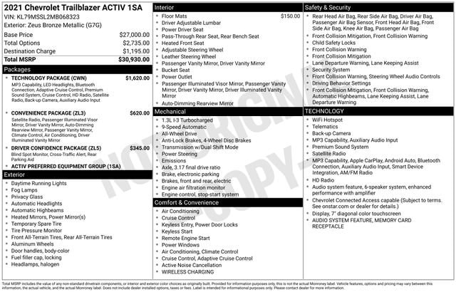1 Type-A & 1 Type-C USB Charging-Only Ports, 120-Volt Power Outlet, 4.2 Diagonal Multi-Color Driver Info Center, 8 Diagonal Color Touchscreen Display, Adaptive Cruise Control, Bose Premium 7-Speaker Audio System Feature, Convenience Package, Driver & Front Passenger Illuminated Vanity Mirrors, Driver Confidence Package, HD Rear Vision Camera, Inside Rear-View Auto-Dimming Mirror, Lane Change Alert w/Side Blind Zone Alert, LED Headlamps, Radio: Chevrolet Infotainment 3 Plus System, Rear Cross Traffic Alert, Rear Park Assist, Single-Zone Auto Climate Control Air Conditioning, SiriusXM Radio, Technology Package, Wireless Charging, 2-Way Power Driver Lumbar Seat Adjuster, 3.17 Axle Ratio, 4-Way Manual Front Passenger Seat Adjuster, 4-Wheel Disc Brakes, 6 Speakers, 6-Speaker Audio System Feature w/Amplifier, 8-Way Power Driver Seat Adjuster, ABS brakes, Air Conditioning, All-Weather Floor Mats, Alloy wheels, AM/FM radio, Apple CarPlay/Android Auto, Auto High-beam Headlights, Brake assist, Bumpers: body-color, Cabin Humidity Sensor, Compass, Delay-off headlights, Driver door bin, Driver vanity mirror, Dual front impact airbags, Dual front side impact airbags, Electronic Stability Control, Emergency communication system: OnStar and Chevrolet connected services capable, Exterior Parking Camera Rear, Flat-Folding Front Passenger Seatback, Front anti-roll bar, Front Bucket Seats, Front Center Armrest, Front fog lights, Front reading lights, Front wheel independent suspension, Fully automatic headlights, HD Radio, Heated door mirrors, Heated Driver & Front Passenger Seats, Heated front seats, Illuminated entry, Knee airbag, Leather Shift Knob, Leather steering wheel, Leatherette Seat Trim, Low tire pressure warning, Memory Card Receptacle, Occupant sensing airbag, Overhead airbag, Overhead console, Panic alarm, Passenger door bin, Passenger vanity mirror, Power door mirrors, Power driver seat, Power steering, Power windows, Preferred Equipment Group 1SA, Radio data system, Radio: Chevrolet Infotainment 3 System, Rear seat center armrest, Rear side impact airbag, Rear window defroster, Rear window wiper, Remote keyless entry, Ride & Handling Suspension, Roof rack: rails only, Security system, SiriusXM w/360L, Speed control, Split folding rear seat, Spoiler, Steering wheel mounted audio controls, Summit White Two-Tone Roof, Tachometer, Telescoping steering wheel, Tilt steering wheel, Traction control, Trip computer, Variably intermittent wipers, Wheels: 17 High Gloss Black Machined Aluminum, Wireless Apple CarPlay/Android Auto, 1 Type-A & 1 Type-C USB Charging-Only Ports, 120-Volt Power Outlet, 4.2 Diagonal Multi-Color Driver Info Center, 8 Diagonal Color Touchscreen Display, Adaptive Cruise Control, Bose Premium 7-Speaker Audio System Feature, Convenience Package, Driver & Front Passenger Illuminated Vanity Mirrors, Driver Confidence Package, HD Rear Vision Camera, Inside Rear-View Auto-Dimming Mirror, Lane Change Alert w/Side Blind Zone Alert, LED Headlamps, Radio: Chevrolet Infotainment 3 Plus System, Rear Cross Traffic Alert, Rear Park Assist, Single-Zone Auto Climate Control Air Conditioning, SiriusXM Radio, Technology Package, Wireless Charging.