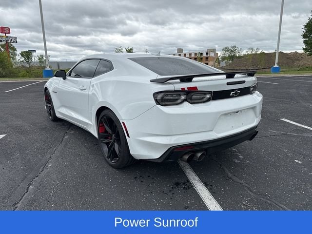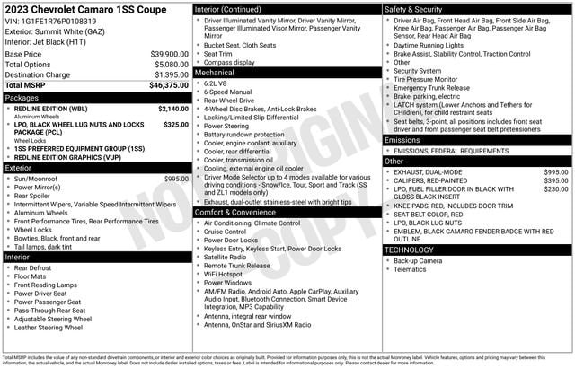 Black Camaro Emblem Fender Badge w/Red Outline, Power Sunroof, Red Knee Pads, Red Seat Belt Color, Redline Edition, Redline Edition Graphics, Wheels: 20 x 8.5Fr/20 x 9.5 Rr Aluminum, 4-Wheel Disc Brakes, 6 Speakers, 6-Speaker Audio System Feature, 6-Way Power Front Passenger Seat Adjuster, 8-Way Power Driver Seat Adjuster, ABS brakes, Air Conditioning, Alloy wheels, Apple CarPlay/Android Auto, Automatic temperature control, Black Fuel Filler Door w/Gloss Black Insert (LPO), Black Lug Nuts (LPO), Black Wheel Locks (LPO), Black Wheel Lug Nuts & Locks Package (LPO), Bluetooth® For Phone, Brake assist, Bumpers: body-color, Cloth Seat Trim, Compass, Delay-off headlights, Driver door bin, Driver vanity mirror, Dual front impact airbags, Dual front side impact airbags, Dual Mode Exhaust, Electronic Stability Control, Exterior Parking Camera Rear, Four wheel independent suspension, Front anti-roll bar, Front Bucket Seats, Front Center Armrest, Front reading lights, Front Sport Bucket Seats, Fully automatic headlights, Illuminated entry, Knee airbag, Leather Shift Knob, Low tire pressure warning, Occupant sensing airbag, Overhead airbag, Panic alarm, Passenger door bin, Passenger vanity mirror, Power door mirrors, Power driver seat, Power passenger seat, Power steering, Power windows, Premium audio system: Chevrolet Infotainment System, Radio data system, Radio: Chevrolet Infotainment 3 Plus System, Rear anti-roll bar, Rear window defroster, Red-Painted Calipers, Remote keyless entry, Security system, SiriusXM w/360L, Speed control, Speed-sensing steering, Steering wheel mounted audio controls, Tachometer, Telescoping steering wheel, Tilt steering wheel, Traction control, Trip computer, Variably intermittent wipers, Voltmeter, Black Camaro Emblem Fender Badge w/Red Outline, Power Sunroof, Red Knee Pads, Red Seat Belt Color, Redline Edition, Redline Edition Graphics, Wheels: 20 x 8.5Fr/20 x 9.5 Rr Aluminum.