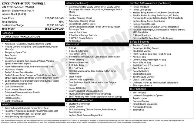 1-Yr SiriusXM Guardian Trial, 2-Piece Shark Fin Antenna, 4-Wheel Disc Brakes, 4G LTE Wi-Fi Hot Spot, 6 Speakers, 8.4 Touchscreen Display, ABS brakes, Air Conditioning, Alloy wheels, AM/FM radio: SiriusXM, Anti-whiplash front head restraints, Apple CarPlay, Apple CarPlay/Android Auto, Auto-dimming door mirrors, Auto-Dimming Exterior Driver Mirror, Auto-dimming Rear-View mirror, Automatic temperature control, Blind Spot & Cross Path Detection, Body Color Exterior Mirrors, Brake assist, Bumpers: body-color, Compass, Delay-off headlights, Driver door bin, Driver vanity mirror, Dual front impact airbags, Dual front side impact airbags, Electronic Stability Control, Emergency communication system: SiriusXM Guardian, Exterior Mirrors Courtesy Lamps, Exterior Mirrors w/Heating Element, Exterior Mirrors w/Supplemental Signals, For Details, Visit DriveUconnect.com, For More Info, Call 800-643-2112, Four wheel independent suspension, Front anti-roll bar, Front Bucket Seats, Front Center Armrest, Front dual zone A/C, Front fog lights, Front reading lights, Fully automatic headlights, Garage door transmitter, Google Android Auto, GPS Antenna Input, HD Radio, Heated door mirrors, Heated Front Seats, Heated front seats, Illuminated entry, Integrated Voice Command w/Bluetooth, Knee airbag, Leather Trimmed Bucket Seats, Low tire pressure warning, Media Hub (2 USB, AUX), Occupant sensing airbag, Outside temperature display, Overhead airbag, Overhead console, Panic alarm, ParkView Rear Back-Up Camera, Passenger door bin, Passenger vanity mirror, Power 2-Way Driver Lumbar Adjust, Power 2-Way Passenger Lumbar Adjust, Power door mirrors, Power driver seat, Power Front Driver/Passenger Seats, Power passenger seat, Power steering, Power windows, Quick Order Package 2EF, Radio data system, Radio: Uconnect 4C w/8.4 Display, Rear anti-roll bar, Rear reading lights, Rear seat center armrest, Rear window defroster, Remote keyless entry, Security system, SiriusXM Radio Service, SiriusXM Satellite Radio, Speed control, Speed-sensing steering, Split folding rear seat, Steering wheel mounted audio controls, Tachometer, Telescoping steering wheel, Tilt steering wheel, Traction control, Trip computer, Turn signal indicator mirrors, USB Host Flip, Variably intermittent wipers, Wheels: 20 x 8.0 Black Noise Aluminum.