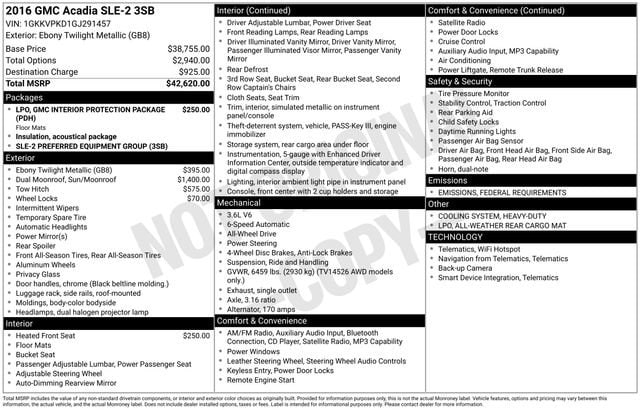 18 x 7.5 Aluminum (4) Wheels, 1st & 2nd Row All-Weather Floor Mats, 2-Way Power Front Passenger Seat, 3.16 Axle Ratio, 3rd Row All-Weather Floor Mats, 3rd row seats: split-bench, 4-Wheel Disc Brakes, 6 Speakers, 6-Speaker Audio System, 7-Passenger Seating (2-2-3 Seating Configuration), 8-Way Power Driver Seat, ABS brakes, Acoustical Insulation Package, Air Conditioning, Alloy wheels, AM/FM radio: SiriusXM, Auto-dimming Rear-View mirror, Black Power-Adjustable Outside Mirrors, Body-Color Bodyside Moldings, Bodyside moldings, Brake assist, Bumpers: body-color, Carpeted Removable Front 2nd & 3rd Row Floor Mats, CD player, Compass, Constant Effort Power Steering, Delay-off headlights, Driver door bin, Driver vanity mirror, Dual front impact airbags, Dual front side impact airbags, Dual SkyScape 2-Panel Power Sunroof, Electronic Stability Control, Emergency communication system: OnStar Guidance, Exterior Parking Camera Rear, Four wheel independent suspension, Front anti-roll bar, Front Bucket Seats, Front Center Armrest w/Storage, Front reading lights, Fully automatic headlights, GMC Interior Protection Package (LPO), Heated Driver & Front Passenger Seats, Heavy-Duty Cooling System, Illuminated entry, Inside Rear-View Auto-Dimming Mirror, Leather-Wrapped Steering Wheel, Low tire pressure warning, Occupant sensing airbag, Outside temperature display, Overhead airbag, Overhead console, Panic alarm, Passenger door bin, Passenger vanity mirror, Power door mirrors, Power driver seat, Power Liftgate, Power passenger seat, Power Rear Liftgate Body, Power steering, Power windows, Power Windows w/Driver Express-Down, Preferred Equipment Group 3SB, Premium Cloth Seat Trim, Radio data system, Radio: Color Touch AM/FM/CD w/IntelliLink, Rear air conditioning, Rear All-Weather Cargo Mat (LPO), Rear anti-roll bar, Rear Parking Sensors, Rear reading lights, Rear window defroster, Rear window wiper, Remote keyless entry, Remote Vehicle Start, Roof rack: rails only, Single Outlet Exhaust, Single-Zone Manual Front Climate Control, SiriusXM Satellite Radio, Speed control, Spoiler, Steering Wheel Mounted Audio Controls, Steering wheel mounted audio controls, Tachometer, Telescoping steering wheel, Tilt & Telescopic Steering Column, Tilt steering wheel, Traction control, Trailer Hitch, Trailering Equipment, Trip computer, Variably intermittent wipers, Voltmeter, Wheel Locks.