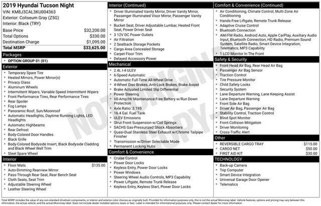 4-Wheel Disc Brakes, 8 Speakers, ABS brakes, Air Conditioning, Alloy wheels, AM/FM radio: SiriusXM, Apple CarPlay & Android Auto, Auto High-beam Headlights, Auto-dimming Rear-View mirror, Automatic temperature control, Axle Ratio: 3.195, Brake assist, Bumpers: body-color, Cargo Net, Carpeted Floor Mats, Cloth Seat Trim, Delay-off headlights, Driver door bin, Driver vanity mirror, Dual front impact airbags, Dual front side impact airbags, Electronic Stability Control, Emergency communication system: Blue Link, Exterior Parking Camera Rear, First Aid Kit, Four wheel independent suspension, Front anti-roll bar, Front Bucket Seats, Front Center Armrest, Front dual zone A/C, Front fog lights, Front reading lights, Fully automatic headlights, Garage door transmitter: HomeLink, Heated door mirrors, Heated Front Bucket Seats, Heated front seats, Illuminated entry, Leather Shift Knob, Low tire pressure warning, Occupant sensing airbag, Option Group 01, Outside temperature display, Overhead airbag, Overhead console, Panic alarm, Passenger door bin, Passenger vanity mirror, Power door mirrors, Power driver seat, Power Liftgate, Power moonroof, Power steering, Power windows, Radio: Infinity Audio System, Rear anti-roll bar, Rear seat center armrest, Rear window defroster, Rear window wiper, Remote keyless entry, Reversible Cargo Tray, Roof rack: rails only, Security system, Speed control, Speed-sensing steering, Split folding rear seat, Spoiler, Steering wheel mounted audio controls, Tachometer, Telescoping steering wheel, Tilt steering wheel, Traction control, Trip computer, Variably intermittent wipers, Wheels: 19 BBS Alloy w/Black Satin-Finish.