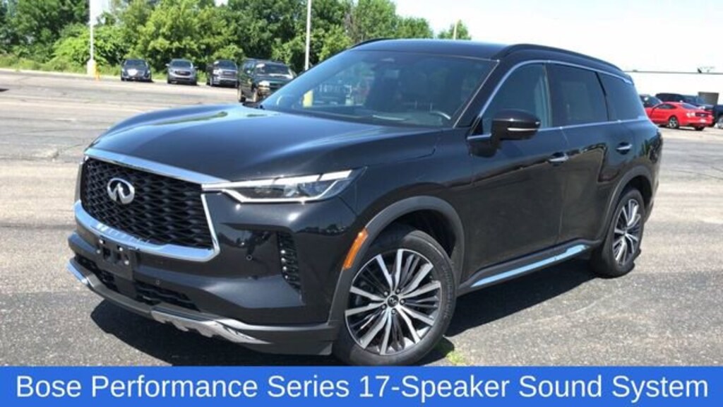 Bose Performance Series 17-Speaker Sound System, Navigation system: INFINITI InTouch Navigation, Power Liftgate, Speed control, Wheels: 20 x 8J Luxury Machined Aluminum Alloy, 17 Speakers, 3rd row seats: bench, 4-Wheel Disc Brakes, 4.334 Axle Ratio, ABS brakes, Air Conditioning, Alloy wheels, AM/FM radio: SiriusXM, Anti-whiplash front head restraints, Auto High-beam Headlights, Auto-dimming door mirrors, Auto-dimming Rear-View mirror, Automatic temperature control, Brake assist, Bumpers: body-color, Delay-off headlights, Driver door bin, Driver vanity mirror, Dual front impact airbags, Dual front side impact airbags, Electronic Stability Control, Emergency communication system, Four wheel independent suspension, Front anti-roll bar, Front Bucket Seats, Front Center Armrest, Front dual zone A/C, Front reading lights, Fully automatic headlights, Garage door transmitter: HomeLink, Heads-Up Display, Heated & Cooled Front Bucket Seats, Heated door mirrors, Heated front seats, Heated rear seats, Heated steering wheel, Illuminated entry, Knee airbag, Leather Shift Knob, Leather steering wheel, Low tire pressure warning, Memory seat, Occupant sensing airbag, Outside temperature display, Overhead airbag, Overhead console, Panic alarm, Passenger door bin, Passenger vanity mirror, Power door mirrors, Power driver seat, Power moonroof, Power passenger seat, Power steering, Power windows, Radio data system, Radio: AM/FM Audio System, Rain sensing wipers, Rear air conditioning, Rear anti-roll bar, Rear reading lights, Rear side impact airbag, Rear window defroster, Rear window wiper, Reclining 3rd row seat, Remote keyless entry, Roof rack: rails only, Security system, Semi Aniline Leather Seating Surfaces, Speed-sensing steering, Speed-Sensitive Wipers, Split folding rear seat, Spoiler, Steering wheel memory, Steering wheel mounted audio controls, Tachometer, Telescoping steering wheel, Tilt steering wheel, Traction control, Trip computer, Turn signal indicator mirrors, Variably intermittent wipers, Ventilated front seats, Bose Performance Series 17-Speaker Sound System, Navigation system: INFINITI InTouch Navigation, Power Liftgate, Speed control, Wheels: 20 x 8J Luxury Machined Aluminum Alloy.