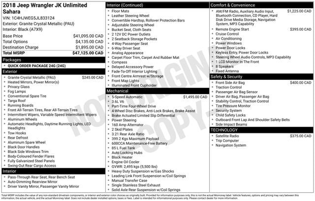GPS Navigation, 18 x 7.5 Polished Satin Carbon Wheels, 3.21 Rear Axle Ratio, 4-Wheel Disc Brakes, 40GB Hard Drive w/28GB Available, 5-Year SiriusXM Travel Link Service, 6.5 Touchscreen Display, 8 Speakers, ABS brakes, Air Conditioning, Alloy wheels, AM/FM radio: SiriusXM, Audio Jack Input for Mobile Devices, Auto-dimming Rear-View mirror, Body Color Appliques Front Bumper, Body Color Appliques Rear Bumper, Body Color/Accent Color Grille, Brake assist, CD player, Cloth Seats w/Adjustable Head Restraints, Compass, Driver door bin, Driver Height Adjuster Seat, Driver vanity mirror, Dual front impact airbags, Electronic Stability Control, Front anti-roll bar, Front Bucket Seats, Front Center Armrest w/Storage, Front fog lights, Front reading lights, Front Seat Back Map Pockets, Fully automatic headlights, Heated door mirrors, Heavy Duty Suspension w/Gas Shocks, Illuminated entry, Integrated roll-over protection, Leather steering wheel, Low tire pressure warning, Occupant sensing airbag, Outside temperature display, Panic alarm, Passenger door bin, Passenger vanity mirror, Power door mirrors, Power steering, Power windows, Quick Order Package 24G, R1234YF A/C Refrigerant, Radio data system, Radio: 130, Radio: 430 Nav, Rear anti-roll bar, Remote keyless entry, Remote Start System, Remote USB Port, Security system, SiriusXM Travel Link, Speed control, Split folding rear seat, Steering wheel mounted audio controls, Sunrider Soft Top, Supplemental Front Seat Side Airbags, Tachometer, Tilt steering wheel, Traction control, Trip computer, Variably intermittent wipers, GPS Navigation.