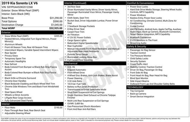 17 x 7.0 Alloy Wheels, 3.32 Axle Ratio, 3rd row seats: split-bench, 4-Wheel Disc Brakes, 6 Speakers, ABS brakes, Air Conditioning, Alloy wheels, AM/FM radio, Apple CarPlay & Android Auto, Automatic temperature control, Brake assist, Bumpers: body-color, Carpeted Floor Mats (7-Passenger), Delay-off headlights, Driver door bin, Driver vanity mirror, Dual front impact airbags, Dual front side impact airbags, Electronic Stability Control, Exterior Parking Camera Rear, Four wheel independent suspension, Front anti-roll bar, Front Bucket Seats, Front Center Armrest, Front dual zone A/C, Front reading lights, Fully automatic headlights, Heated door mirrors, Illuminated entry, Low tire pressure warning, Occupant sensing airbag, Outside temperature display, Overhead airbag, Overhead console, Panic alarm, Passenger door bin, Passenger vanity mirror, Power door mirrors, Power driver seat, Power steering, Power windows, Radio data system, Radio: UVO Play w/AM/FM/MP3, Rear anti-roll bar, Rear seat center armrest, Rear window defroster, Rear window wiper, Remote keyless entry, Security system, Speed control, Speed-sensing steering, Split folding rear seat, Spoiler, Steering wheel mounted audio controls, Tachometer, Telescoping steering wheel, Tilt steering wheel, Traction control, Trip computer, Turn signal indicator mirrors, Variably intermittent wipers, YES Essentials Cloth Seat Trim.