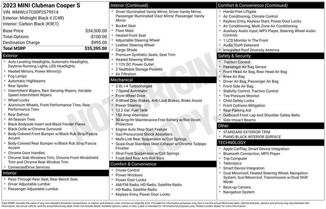 4-Wheel Disc Brakes, 6 Speakers, ABS brakes, Air Conditioning, Alloy wheels, AM/FM Radio, AM/FM radio: SiriusXM, Apple CarPlay Compatibility, Auto High-beam Headlights, Automatic temperature control, Brake assist, Bumpers: body-color, ConnectedDrive Services, Delay-off headlights, Driver door bin, Driver vanity mirror, Dual front impact airbags, Dual front side impact airbags, Electronic Stability Control, Emergency communication system: MINI Intelligent Emergency Call, Enhanced USB & Bluetooth, Exterior Parking Camera Rear, Four wheel independent suspension, Front anti-roll bar, Front Bucket Seats, Front Center Armrest, Front dual zone A/C, Front fog lights, Front reading lights, Front Sport Seats, Fully automatic headlights, Heated door mirrors, Heated Front Seats, Heated front seats, Heated steering wheel, Heated Steering Wheel Credit, Illuminated entry, Knee airbag, Leather steering wheel, Low tire pressure warning, Media Display (6UF), MINI Assist eCall, MINI Connected, MINI TeleServices, Occupant sensing airbag, Outside temperature display, Overhead airbag, Overhead console, Passenger door bin, Passenger Seat Height Adjustment, Passenger vanity mirror, Power door mirrors, Power steering, Power windows, Radio Control US, Radio data system, Rain sensing wipers, Rear anti-roll bar, Rear window defroster, Rear window wiper, Remote keyless entry, Remote Services, Sensatec Leatherette Upholstery, SiriusXM Satellite Radio, Speed control, Speed-sensing steering, Speed-Sensitive Wipers, Split folding rear seat, Spoiler, Sport steering wheel, Steering wheel mounted audio controls, Tachometer, Telescoping steering wheel, Tilt steering wheel, Traction control, Trip computer, Variably intermittent wipers, Wheels: 17 x 7.5 Vent Spoke Silver Alloy.