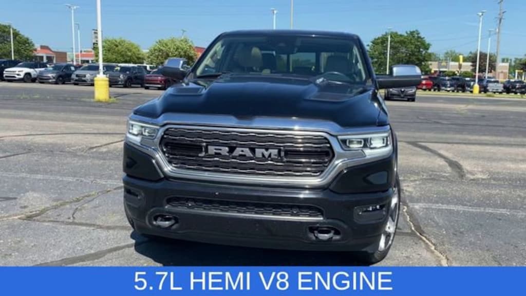 HEMI 5.7L V8 Multi Displacement VVT, 4 Adjustable Cargo Tie-Down Hooks, Adaptive Cruise Control w/Stop & Go, Advanced Brake Assist, Apple CarPlay, Bed Utility Group, Dome Dual LED Reading Lamp, Dual-Pane Panoramic Sunroof, Full Speed Forward Collision Warning Plus, GPS Navigation, harman/kardon 19 Speaker Premium Sound, Heated front seats, Lane Keep Assist, LED Dome/Reading Lamp, Limited Level 1 Equipment Group, Navigation System, Parallel & Perp Park Assist w/Stop, ParkView Rear Back-Up Camera, Pick-Up Box Lighting, Power Chrome Trailer Tow Mirrors, Quick Order Package 27M Limited, RamBox Cargo Management System, Trailer Brake Control, Trailer Tow Group, Trailer Tow Mirrors, Ventilated Rear Seats, Wheels: 22 x 9 Polish/Painted w/Inserts, 1-Yr SiriusXM Guardian Trial, 10 Speakers, 12 Touchscreen Display, 3.21 Rear Axle Ratio, 33 Gallon Fuel Tank, 4-Wheel Disc Brakes, 48V Belt Starter Generator, ABS brakes, Adjustable pedals, Air Conditioning, Alloy wheels, AM/FM radio: SiriusXM with 360L, Anti-Spin Differential Rear Axle, Apple CarPlay/Android Auto, Audio memory, Auto High-beam Headlights, Auto-dimming door mirrors, Auto-dimming Rear-View mirror, Auto-leveling suspension, Automatic temperature control, Body Color Bumper Group, Body Color Rear Bumper w/Step Pads, Bodyside moldings, Brake assist, Bumpers: chrome, Compass, Delay-off headlights, Disassociated Touchscreen Display, Driver door bin, Driver vanity mirror, Dual front impact airbags, Dual front side impact airbags, Electronic Stability Control, Emergency communication system: SiriusXM Guardian, Front anti-roll bar, Front Bucket Seats, Front Center Armrest w/Storage, Front dual zone A/C, Front fog lights, Front reading lights, Front wheel independent suspension, Fully automatic headlights, Garage door transmitter, Genuine wood console insert, Genuine wood dashboard insert, Genuine wood door panel insert, Google Android Auto, GPS Antenna Input, HD Radio, Heated door mirrors, Heated rear seats, Heated steering wheel, Illuminated entry, Integrated Center Stack Radio, Leather steering wheel, Low tire pressure warning, Manufacturer's Statement of Origin, Memory seat, Occupant sensing airbag, Outside temperature display, Overhead airbag, Overhead console, Panic alarm, Passenger door bin, Passenger vanity mirror, Pedal memory, Power door mirrors, Power driver seat, Power passenger seat, Power steering, Power windows, Premium Leather Trimmed Bucket Seats, Radio data system, Radio: Uconnect 12 w/Navigation, Rain sensing wipers, Rear anti-roll bar, Rear seat center armrest, Rear step bumper, Rear window defroster, Remote CD player, Remote keyless entry, Security system, SiriusXM Satellite Radio, SiriusXM Traffic Plus, SiriusXM Travel Link, SiriusXM w/360L, Speed control, Split folding rear seat, Steering wheel mounted audio controls, Tachometer, Telescoping steering wheel, Tilt steering wheel, Traction control, Trip computer, Turn signal indicator mirrors, USB Host Flip, Variably intermittent wipers, Ventilated front seats, Voltmeter, Wheels: 20 x 9 Polished w/Inserts, Clean Carfax, 5.7L HEMI V8 ENGINE, HEMI 5.7L V8 Multi Displacement VVT, 4 Adjustable Cargo Tie-Down Hooks, Adaptive Cruise Control w/Stop & Go, Advanced Brake Assist, Apple CarPlay, Bed Utility Group, Dome Dual LED Reading Lamp, Dual-Pane Panoramic Sunroof, Full Speed Forward Collision Warning Plus, GPS Navigation, harman/kardon 19 Speaker Premium Sound, Heated front seats, Lane Keep Assist, LED Dome/Reading Lamp, Limited Level 1 Equipment Group, Navigation System, Parallel & Perp Park Assist w/Stop, ParkView Rear Back-Up Camera, Pick-Up Box Lighting, Power Chrome Trailer Tow Mirrors, Quick Order Package 27M Limited, RamBox Cargo Management System, Trailer Brake