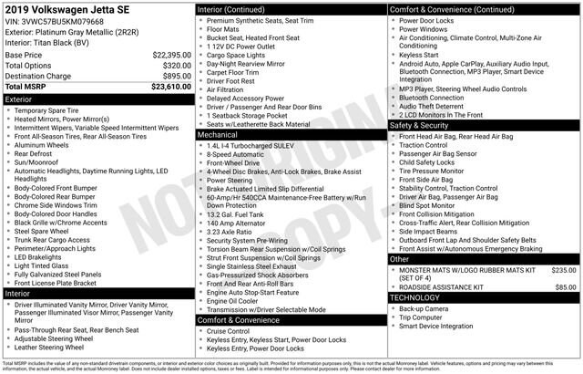 Discover the perfect blend of style, performance, and efficiency in this 2019 Volkswagen Jetta 1.4T SE. This sleek and sophisticated sedan boasts a striking Gray exterior that commands attention on the road. Powered by a 1.4L TSI engine and an 8-Speed Automatic with Tiptronic transmission, this Jetta delivers an impressive 30 city / 40 highway MPG, making it an exceptional choice for the modern driver.Highlighted features include:- ROADSIDE ASSISTANCE KIT with booster cables, warning triangle, LED flashlight, work gloves, multi-tool, and more- MONSTER MATS W/LOGO RUBBER MATS KIT (SET OF 4)- Heavy Duty Trunk Liner w/VW CarGo Blocks- Speed control- Exterior Parking Camera RearThe well-appointed interior of this Jetta 1.4T SE offers a wealth of thoughtful amenities, including:- 4 Speakers- AM/FM radio- Radio data system- Radio: Composition Color w/6.5 Touchscreen- Air Conditioning- Rear window defroster- Power steering- Power windows- Remote keyless entry- Steering wheel mounted audio controlsSafety is paramount in this Jetta, with features like Brake assist, Electronic Stability Control, Speed-sensing steering, and Traction control ensuring a confident and secure driving experience. The Fully automatic headlights and Delay-off headlights provide excellent visibility, while the Bumpers: body-color and Power door mirrors add a touch of refinement.This 2019 Volkswagen Jetta 1.4T SE is a standout choice for those seeking a well-equipped, fuel-efficient, and stylish sedan. Experience the exceptional value and driving dynamics that make the Jetta a beloved choice among discerning buyers. We invite you to schedule a test drive and discover the joy of ownership for yourself.