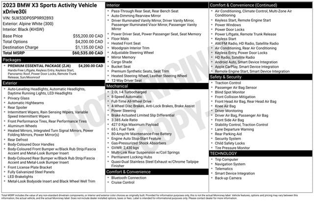 Connected Package Pro, Navigation System, 12 Speakers, 3.385 Axle Ratio, 4-Wheel Disc Brakes, ABS brakes, Air Conditioning, Alloy wheels, AM/FM Radio, AM/FM radio: SiriusXM, Apple CarPlay & Android Auto Compatibility, Auto High-beam Headlights, Auto-dimming door mirrors, Auto-dimming Rear-View mirror, Automatic temperature control, BMW Assist eCall, BMW TeleServices, Brake assist, Bumpers: body-color, ConnectedDrive Services, Delay-off headlights, Driver door bin, Driver vanity mirror, Dual front impact airbags, Dual front side impact airbags, Electronic Stability Control, Emergency communication system: BMW Assist eCall, Enhanced USB & Bluetooth w/Smartphone Integration, Exterior Parking Camera Rear, Four wheel independent suspension, Front anti-roll bar, Front Bucket Seats, Front Center Armrest, Front dual zone A/C, Front reading lights, Fully automatic headlights, Garage door transmitter, Genuine wood dashboard insert, Genuine wood door panel insert, Heated door mirrors, Hi-Fi Sound System, Illuminated entry, Knee airbag, Low tire pressure warning, Memory seat, Navigation, Occupant sensing airbag, Outside temperature display, Overhead airbag, Panic alarm, Passenger door bin, Passenger vanity mirror, Perforated SensaTec Upholstery, Power door mirrors, Power driver seat, Power Front Seats, Power Liftgate, Power passenger seat, Power steering, Power windows, Radio data system, Rain sensing wipers, Rear air conditioning, Rear anti-roll bar, Rear reading lights, Rear seat center armrest, Rear window defroster, Rear window wiper, Remote keyless entry, Security system, SiriusXM Satellite Radio, Speed control, Speed-sensing steering, Speed-Sensitive Wipers, Split folding rear seat, Spoiler, Sport Seats, Sport steering wheel, Steering wheel mounted audio controls, Tachometer, Telescoping steering wheel, Tilt steering wheel, Traction control, Trip computer, Turn signal indicator mirrors, Variably intermittent wipers, Wheels: 19 x 7.5 Y-Spoke (Style 693), WiFi Hotspot, Connected Package Pro, Navigation System.