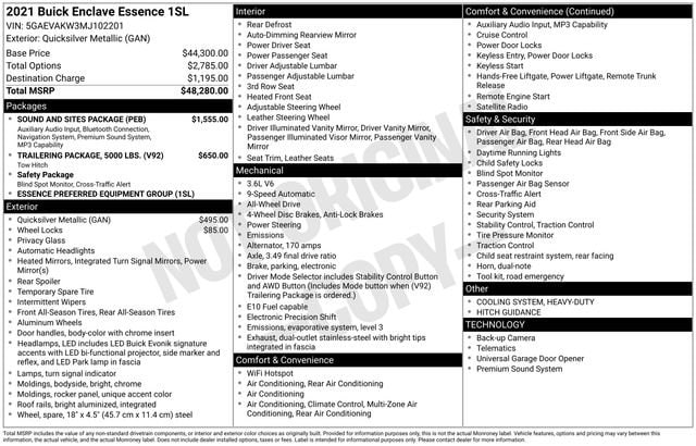5000lbs Trailering Package, Heavy-Duty Cooling System, Hitch Guidance, Hitch Guidance w/Hitch View, Radio: Buick Infotainment Sys AM/FM Stereo w/Nav, Sound & Sites Package, 120-Volt Power Outlet, 18 Painted Aluminum Wheels, 3.49 Axle Ratio, 3rd row seats: split-bench, 4-Wheel Disc Brakes, 6 Speakers, 6-Speaker Audio System Feature, 7-Passenger Seating, ABS brakes, Air Conditioning, Alloy wheels, AM/FM radio: SiriusXM with 360L, Apple CarPlay/Android Auto, Auto-dimming door mirrors, Auto-dimming Rear-View mirror, Automatic temperature control, Bose Performance-Enhanced 10-Speaker System, Brake assist, Bumpers: body-color, Compass, Delay-off headlights, Driver door bin, Driver vanity mirror, Dual front impact airbags, Dual front side impact airbags, Electronic Stability Control, Emergency communication system: OnStar and Buick connected services capable, Four wheel independent suspension, Front anti-roll bar, Front Bucket Seats, Front Center Armrest, Front dual zone A/C, Front reading lights, Fully automatic headlights, Garage door transmitter, Heated door mirrors, Heated Driver & Front Passenger Seats, Heated front seats, Illuminated entry, Leather steering wheel, Low tire pressure warning, Occupant sensing airbag, Outside temperature display, Overhead airbag, Overhead console, Panic alarm, Passenger door bin, Passenger vanity mirror, Perforated Leather-Appointed Seat Trim, Power door mirrors, Power Driver Lumbar Control Seat Adjuster, Power driver seat, Power Liftgate, Power Passenger Lumbar Control Seat Adjuster, Power passenger seat, Power steering, Power windows, Preferred Equipment Group 1SL, Premium audio system: Buick Infotainment System, Radio data system, Radio: Buick Infotainment System AM/FM Stereo, Rear air conditioning, Rear anti-roll bar, Rear Parking Sensors, Rear reading lights, Rear window defroster, Rear window wiper, Remote keyless entry, Roof rack: rails only, Security system, SiriusXM w/360L, Speed control, Speed-sensing steering, Spoiler, Steering wheel mounted audio controls, Tachometer, Telescoping steering wheel, Tilt steering wheel, Traction control, Trip computer, Turn signal indicator mirrors, Variably intermittent wipers, Voltmeter, Wheel Locks, 5000lbs Trailering Package, Heavy-Duty Cooling System, Hitch Guidance, Hitch Guidance w/Hitch View, Radio: Buick Infotainment Sys AM/FM Stereo w/Nav, Sound & Sites Package.
