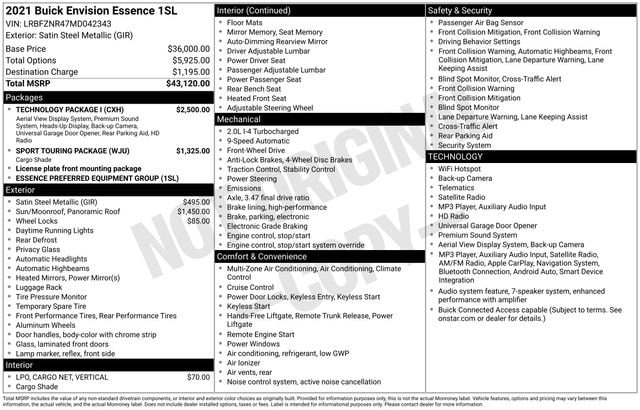 Certified.Certification Program Details: Include a standard 12-month, 12,000-mile (whichever comes first) limited bumper-to-bumper warranty. - If the vehicle has remaining new vehicle bumper-to-bumper limited warranty coverage, the CarBravo warranty coverage applies after expiration of the original new vehicle limited bumper-to-bumper warranty - If the vehicleâs original new vehicle limited bumper-to-bumper warranty has expired due to time or mileage, the CarBravo warranty coverage becomes effective on the day of the sale of the CarBravo vehicleWelcome to Shea Automotive! We have 800+ used cars in ONE LOCATION! Stop in at 2100 S Linden Rd. Flint, MI 48532 or call 810-732-7500 to schedule a test drive!3-Channel Programmable Universal Home Remote, Black Roof Rack Cross Rails, Body-Color Door Handles, Front & Rear Park Assist, HD Radio, HD Surround Vision, Head-Up Display, Lower Trim/Wheel Arch Moldings, Memory Card Receptacle Audio System Feature, Radio: Buick Infotainment System AM/FM w/Nav, Rear Cargo Compartment Cover, Sport Touring Package, Technology Package I, Wheels: 20 Aluminum w/Dark Finish, 18 Machined Aluminum Wheels, 3.47 Final Drive Axle Ratio, 4-Wheel Disc Brakes, 7 Speakers, 7-Speaker Audio System Feature w/Amplifier, 8-Way Power Driver Seat Adjuster, ABS brakes, Air Conditioning, Alloy wheels, AM/FM radio: SiriusXM, Apple CarPlay/Android Auto, Auto High-beam Headlights, Auto-dimming door mirrors, Auto-dimming Rear-View mirror, Automatic temperature control, Brake assist, Bumpers: body-color, Compass, Delay-off headlights, Driver 4-Way Power Lumbar Seat Adjuster, Driver door bin, Driver vanity mirror, Dual front impact airbags, Dual front side impact airbags, Electronic Stability Control, Emergency communication system: OnStar and Buick connected services capable, Four wheel independent suspension, Front anti-roll bar, Front Bucket Seats, Front Center Armrest, Front dual zone A/C, Front Passenger 4-Way Power Lumbar Seat Adjuster, Front Passenger 8-Way Power Seat Adjuster, Front reading lights, Fully automatic headlights, Heated door mirrors, Heated Driver & Front Passenger Seats, Heated front seats, Heated steering wheel, Illuminated entry, Knee airbag, Leather Shift Knob, Low tire pressure warning, Memory seat, Occupant sensing airbag, Outside temperature display, Overhead airbag, Overhead console, Panic alarm, Passenger door bin, Passenger vanity mirror, Perforated Leather-Appointed Seat Trim, Power door mirrors, Power driver seat, Power Liftgate, Power Panoramic Tilt-Sliding Moonroof, Power passenger seat, Power steering, Power windows, Preferred Equipment Group 1SL, Radio data system, Radio: Buick Infotainment System AM/FM Stereo, Rear anti-roll bar, Rear reading lights, Rear seat center armrest, Rear window defroster, Rear window wiper, Remote keyless entry, Roof rack: rails only, Security system, SiriusXM Radio, Speed control, Speed-sensing steering, Split folding rear seat, Spoiler, Steering wheel mounted audio controls, Tachometer, Telescoping steering wheel, Tilt steering wheel, Traction control, Trip computer, USB Charging-Only Ports, USB Ports, Variably intermittent wipers, Vertical Cargo Net (LPO), Wheel Locks, Wireless Apple CarPlay/Wireless Android Auto, 3-Channel Programmable Universal Home Remote, Black Roof Rack Cross Rails, Body-Color Door Handles, Front & Rear Park Assist, HD Radio, HD Surround Vision, Head-Up Display, Lower Trim/Wheel Arch Moldings, Memory Card Receptacle Audio System Feature, Radio: Buick Infotainment System AM/FM w/Nav, Rear Cargo Compartment Cover, Sport Touring Package, Technology Package I, Wheels: 20 Aluminum w/Dark Finish.Essence 2.0L Turbocharged 9-Speed Automatic FWD Satin Steel MetallicRecent Arrival!