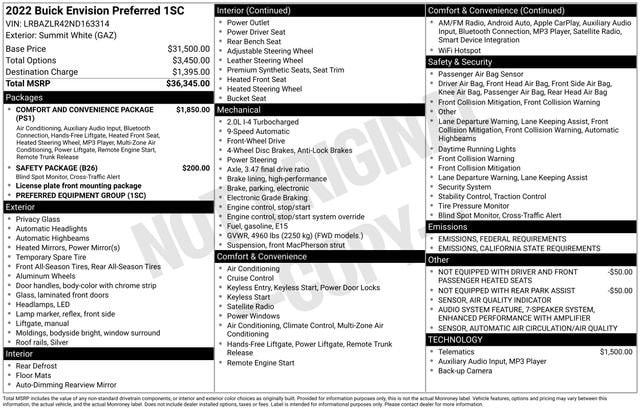 7-Speaker Audio System Feature w/Amplifier, Air Quality Indicator Sensor, Automatic Air Circulation/Air Quality Sensor, Comfort & Convenience Package, Dual-Zone ACC Air Conditioning, Hands Free Power Programmable Liftgate, Heated Driver & Front Passenger Seats, Heated Steering Wheel, Lane Change Alert w/Side Blind Zone Alert, Radio: Buick Infotainment System AM/FM Stereo, Rear Cross Traffic Alert, Remote Vehicle Starter System, Safety Package, 3 Years of OnStar & Connected Services Plan, 3.47 Final Drive Axle Ratio, 4-Wheel Disc Brakes, 6 Speakers, 6-Speaker Audio System Feature, 8-Way Power Driver Seat Adjuster, ABS brakes, Air Conditioning, Alloy wheels, AM/FM radio: SiriusXM, Apple CarPlay/Android Auto, Auto High-beam Headlights, Auto-dimming door mirrors, Auto-dimming Rear-View mirror, Brake assist, Bumpers: body-color, Cloth w/Leatherette Seat Trim, Compass, Delay-off headlights, Driver door bin, Driver vanity mirror, Dual front impact airbags, Dual front side impact airbags, Electronic Stability Control, Emergency communication system: OnStar and Buick connected services capable, Four wheel independent suspension, Front anti-roll bar, Front Bin Center Console USB Ports, Front Bucket Seats, Front Center Armrest, Front Passenger 6-Way Manual Seat Adjuster, Front reading lights, Fully automatic headlights, Heated door mirrors, Illuminated entry, Knee airbag, Low tire pressure warning, Not Equipped w/Driver & Fr Passenger Heated Seats, Not Equipped w/Rear Park Assist, Occupant sensing airbag, Outside temperature display, Overhead airbag, Overhead console, Panic alarm, Passenger door bin, Passenger vanity mirror, Power door mirrors, Power driver seat, Power steering, Power windows, Preferred Equipment Group 1SC, Premium audio system: Buick Infotainment System, Radio data system, Radio: 8 Diagonal Buick Infotainment System, Rear anti-roll bar, Rear reading lights, Rear seat center armrest, Rear window defroster, Rear window wiper, Remote keyless entry, Roof rack: rails only, Security system, SiriusXM Radio, Speed control, Split folding rear seat, Spoiler, Steering wheel mounted audio controls, Telescoping steering wheel, Tilt steering wheel, Traction control, Trip computer, USB Charging-Only Ports, Variably intermittent wipers, Wheels: 18 Aluminum w/Light Charcoal Met Finish, Wireless Apple CarPlay/Wireless Android Auto, 7-Speaker Audio System Feature w/Amplifier, Air Quality Indicator Sensor, Automatic Air Circulation/Air Quality Sensor, Comfort & Convenience Package, Dual-Zone ACC Air Conditioning, Hands Free Power Programmable Liftgate, Heated Driver & Front Passenger Seats, Heated Steering Wheel, Lane Change Alert w/Side Blind Zone Alert, Radio: Buick Infotainment System AM/FM Stereo, Rear Cross Traffic Alert, Remote Vehicle Starter System, Safety Package.