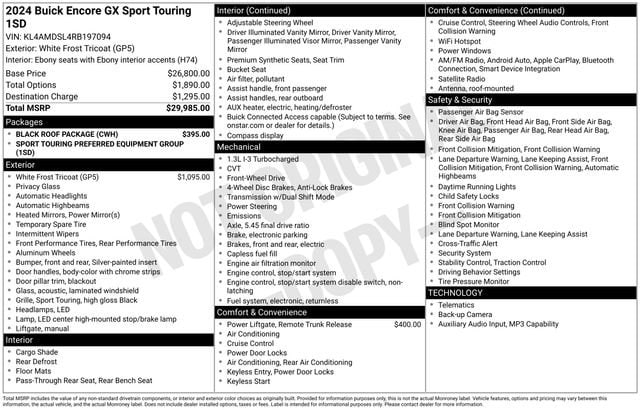 Discover the perfect balance of style, performance, and versatility in the 2024 Buick Encore GX Sport Touring. This captivating compact SUV is designed to elevate your driving experience, offering a harmonious blend of modern amenities and dynamic capabilities.Elevate your commute with the Encore GX's impressive array of features: White Frost Tricoat exterior Power Liftgate Black Roof Package with Black roof rails, Black exterior mirror caps, and Black roof panel Speed control Enhanced Performance 6-Speaker SystemThis Encore GX is a certified pre-owned vehicle, meaning it has undergone a rigorous inspection and reconditioning process to ensure it meets the highest standards of quality and reliability. You can drive with confidence, knowing that this Buick has been meticulously cared for and is ready to provide you with years of exceptional performance and enjoyment.The ECOTEC 1.3L Turbo engine, paired with a smooth-shifting CVT and front-wheel-drive, delivers an exceptional balance of power and efficiency, with an EPA-estimated 29 city/31 highway MPG. Whether you're navigating the city streets or embarking on weekend adventures, the Encore GX offers a dynamic and responsive driving experience that will leave you eager to get behind the wheel.Comfort and convenience are paramount in the Encore GX, with features like automatic temperature control, a power driver's seat, and a premium audio system with wireless Apple CarPlay and Android Auto integration. The spacious interior and versatile cargo area make it easy to accommodate your daily needs and weekend getaways.Safety is also a top priority, with a comprehensive suite of advanced driver-assistance technologies, including forward collision alert, lane-keeping assist, and a rearview camera with rear park assist. You can drive with confidence, knowing that the Encore GX is equipped to help keep you and your loved ones secure on the road.This 2024 Buick Encore GX Sport Touring is a remarkable opportunity to experience the perfect blend of style, performance, and technology. With its exceptional features, impressive efficiency, and certified pre-owned status, this Encore GX is the ideal choice for those seeking a compact SUV that exceeds expectations. Visit our showroom today to take this captivating Buick for a test drive and discover the joy of ownership.