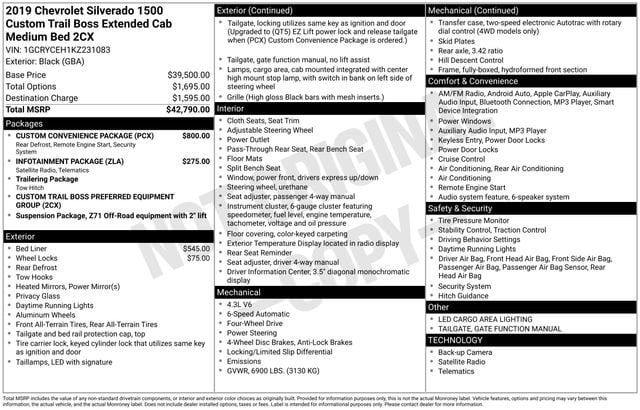 Apple CarPlay/Android Auto, Bluetooth® For Phone, Custom Convenience Package, Electric Rear-Window Defogger, Exterior Parking Camera Rear, EZ Lift Power Lock & Release Tailgate, Heavy-Duty Rear Locking Differential, High Capacity Air Filter, Hill Descent Control, Infotainment Package, LED Cargo Area Lighting, Off-Road Suspension w/2 Lift, OnStar & Chevrolet Connected Services Capable, Remote Vehicle Starter System, SiriusXM Radio, Speed control, Suspension Package, Trailering Package, Wheels: 18 x 8.5 Black Painted Aluminum, 170 Amp Alternator, 3.42 Rear Axle Ratio, 3.5 Diagonal Monochromatic Display, 4-Wheel Disc Brakes, 6 Speakers, ABS brakes, Air Conditioning, Alloy wheels, AM/FM radio, Brake assist, Chevrolet Connected Access, Chevrolet w/4G LTE, Chevytec Spray-On Black Bedliner, Cloth Seat Trim, Color-Keyed Carpeting Floor Covering, Compass, Deep-Tinted Glass, Delay-off headlights, Driver door bin, Driver vanity mirror, Dual front impact airbags, Dual front side impact airbags, Electronic Cruise Control, Electronic Stability Control, Front 40/20/40 Split-Bench Seat, Front anti-roll bar, Front Center Armrest, Front reading lights, Front Rubberized Vinyl Floor Mats, Front wheel independent suspension, Fully automatic headlights, Heated door mirrors, High Gloss Black Grille, Hitch Guidance, Illuminated entry, Locking Tailgate, Low tire pressure warning, Manual Tilt Wheel Steering Column, Occupant sensing airbag, Outside temperature display, Overhead airbag, Overhead console, Panic alarm, Passenger door bin, Passenger vanity mirror, Performance Red Recovery Hooks, Polished Exhaust Tip, Power Door Locks, Power door mirrors, Power Front Windows w/Driver Express Up/Down, Power Front Windows w/Passenger Express Down, Power Rear Windows w/Express Down, Power steering, Power windows, Preferred Equipment Group 2CX, Premium audio system: Chevrolet Infotainment System 3, Radio data system, Radio: Chevrolet Infotainment 3 System, Rear 60/40 Folding Bench Seat (Folds Up), Rear reading lights, Rear Rubberized-Vinyl Floor Mats, Rear step bumper, Remote Keyless Entry, Remote keyless entry, Speed-sensing steering, Split folding rear seat, Tachometer, Theft Deterrent System (Unauthorized Entry), Tilt steering wheel, Traction control, Trip computer, Variably intermittent wipers, Voltmeter, Wheel Locks (Set of 4) (LPO), Apple CarPlay/Android Auto, Bluetooth® For Phone, Custom Convenience Package, Electric Rear-Window Defogger, Exterior Parking Camera Rear, EZ Lift Power Lock & Release Tailgate, Heavy-Duty Rear Locking Differential, High Capacity Air Filter, Hill Descent Control, Infotainment Package, LED Cargo Area Lighting, Off-Road Suspension w/2 Lift, OnStar & Chevrolet Connected Services Capable, Remote Vehicle Starter System, SiriusXM Radio, Speed control, Suspension Package, Trailering Package, Wheels: 18 x 8.5 Black Painted Aluminum.