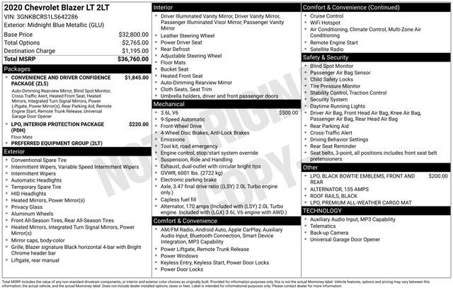 Black Roof Rails, Convenience & Driver Confidence Package, Heated Driver & Front Passenger Seats, Inside Rear-View Auto-Dimming Mirror, Lane Change Alert w/Side Blind Zone Alert, Outside Heated Power-Adjustable Body-Color Mirrors, Rear Cross Traffic Alert, Rear Park Assist w/Audible Warning, Rear Power Programmable Liftgate, Remote Start, Universal Home Remote, 155 Amp Alternator, 170 Amp Alternator, 4-Wheel Disc Brakes, 6 Speakers, 6-Speaker Audio System Feature, ABS brakes, Air Conditioning, Alloy wheels, AM/FM radio: SiriusXM, Apple CarPlay/Android Auto, Automatic temperature control, Brake assist, Bumpers: body-color, Child-Seat-Sensing Airbag, Compass, Delay-off headlights, Driver door bin, Driver vanity mirror, Dual front impact airbags, Dual front side impact airbags, Electronic Stability Control, Emergency communication system: OnStar and Chevrolet connected services capable, Exterior Parking Camera Rear, Four wheel independent suspension, Front & Rear Black Bowtie Emblems (LPO), Front anti-roll bar, Front Bucket Seats, Front Center Armrest, Front dual zone A/C, Front reading lights, Fully automatic headlights, Heated door mirrors, High-Intensity Discharge Headlights, Illuminated entry, Interior Protection Package (LPO), Knee airbag, Leather Shift Knob, Low tire pressure warning, Occupant sensing airbag, Outside temperature display, Overhead airbag, Overhead console, Panic alarm, Passenger door bin, Passenger vanity mirror, Power door mirrors, Power driver seat, Power steering, Power windows, Preferred Equipment Group 2LT, Premium All-Weather Cargo Mat (LPO), Premium All-Weather Floor Mats, Premium Cloth Seat Trim, Radio data system, Radio: Chevrolet Infotainment 3 System, Rear anti-roll bar, Rear reading lights, Rear seat center armrest, Rear window defroster, Rear window wiper, Remote keyless entry, Ride & Handling Suspension, Security system, SiriusXM Radio, Speed control, Speed-sensing steering, Split folding rear seat, Spoiler, Steering wheel mounted audio controls, Tachometer, Telescoping steering wheel, Tilt steering wheel, Traction control, Trip computer, Variably intermittent wipers, Voltmeter, Wheels: 18 Bright Silver Aluminum, Black Roof Rails, Convenience & Driver Confidence Package, Heated Driver & Front Passenger Seats, Inside Rear-View Auto-Dimming Mirror, Lane Change Alert w/Side Blind Zone Alert, Outside Heated Power-Adjustable Body-Color Mirrors, Rear Cross Traffic Alert, Rear Park Assist w/Audible Warning, Rear Power Programmable Liftgate, Remote Start, Universal Home Remote.