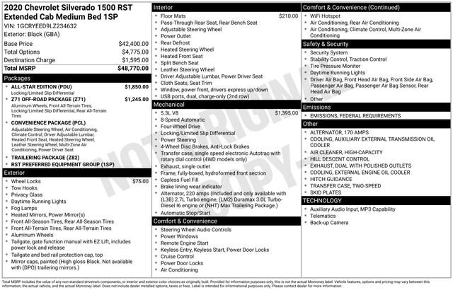 12-Volt Rear Auxiliary Power Outlet, 2 USB Ports (First Row), 4-Way Manual Driver Seat Adjuster, 4.2 Diagonal Color Display Driver Info Center, 6-Speaker Audio System, All-Star Edition, All-Weather Floor Liner (LPO), Bluetooth® For Phone, Body Color Grille, Color-Keyed Carpeting Floor Covering, Compass, Convenience Package, Deep-Tinted Glass, Dual Exhaust w/Polished Outlets, Electric Rear-Window Defogger, Electrical Lock Control Steering Column, Front Frame-Mounted Black Recovery Hooks, Front LED Fog Lamps, Front Rubberized Vinyl Floor Mats, Heavy-Duty Rear Locking Differential, High Capacity Air Filter, High Gloss Black Mirror Caps, Hill Descent Control, Hitch Guidance, Keyless Open & Start, LED Cargo Area Lighting, Manual Tilt-Wheel Steering Column, Off-Road Suspension, OnStar & Chevrolet Connected Services Capable, Power Door Locks, Power Front Windows w/Driver Express Up/Down, Power Front Windows w/Passenger Express Down, Power Rear Windows w/Express Down, Preferred Equipment Group 1SP, Rear 60/40 Folding Bench Seat (Folds Up), Rear Dual USB Charging-Only Ports, Rear Rubberized-Vinyl Floor Mats, Rear Vision Camera, Remote Vehicle Starter System, RST Value Package, Single-Zone Manual/Semi-Automatic Air Conditioning, Steering Wheel Audio Controls, Steering Wheel Mounted Electronic Cruise Control, Theft Deterrent System (Unauthorized Entry), Trailering Package, Urethane Steering Wheel, Z71 Off-Road Package, 10-Way Power Driver Seat w/Lumbar, 170 Amps Alternator, 220 Amps Alternator, 3.23 Rear Axle Ratio, 4-Wheel Disc Brakes, 40/20/40 Front Split-Bench Seat, 4G LTE Wi-Fi Hot Spot Capable, 6 Speakers, ABS brakes, Air Conditioning, All-Weather Floor Liner (LPO) (AAK), Alloy wheels, Apple CarPlay/Android Auto, Auxiliary External Transmission Oil Cooler, Brake assist, Bumpers: body-color, Chevrolet Connected Access Capable, Cloth Seat Trim, Delay-off headlights, Driver door bin, Driver vanity mirror, Dual front impact airbags, Dual front side impact airbags, Dual-Zone Automatic Climate Control, Electronic Stability Control, External Engine Oil Cooler, Front anti-roll bar, Front Center Armrest w/Storage, Front fog lights, Front reading lights, Front wheel independent suspension, Fully automatic headlights, Heated door mirrors, Heated Driver & Front Outboard Passenger Seats, Heated Steering Wheel, Heavy Duty Suspension, Illuminated entry, Leather Wrapped Steering Wheel, Low tire pressure warning, Manual Tilt/Telescoping Steering Column, Occupant sensing airbag, Outside temperature display, Overhead airbag, Overhead console, Panic alarm, Passenger door bin, Passenger vanity mirror, Power door mirrors, Power steering, Power windows, Radio data system, Radio: Chevrolet Infotainment 3 System, Rear reading lights, Rear step bumper, Rear window defroster, Remote keyless entry, Security system, Speed control, Speed-sensing steering, Split folding rear seat, Steering wheel mounted audio controls, Tachometer, Tilt steering wheel, Traction control, Trip computer, Variably intermittent wipers, Voltmeter, Wheel Locks (Set of 4) (LPO), Wheels: 18 x 8.5 Bright Silver Painted Aluminum, 5.3L V8 ENGINE, 12-Volt Rear Auxiliary Power Outlet, 2 USB Ports (First Row), 4-Way Manual Driver