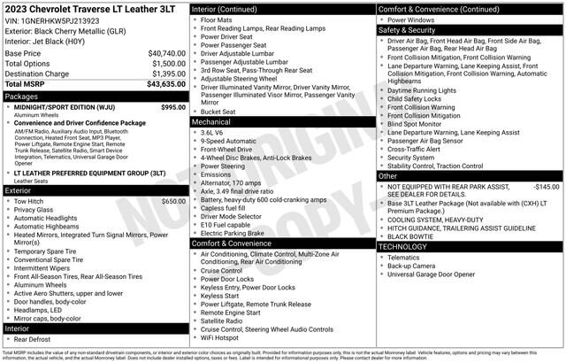 Certified.Certification Program Details: Include a standard 12-month, 12,000-mile (whichever comes first) limited bumper-to-bumper warranty. - If the vehicle has remaining new vehicle bumper-to-bumper limited warranty coverage, the CarBravo warranty coverage applies after expiration of the original new vehicle limited bumper-to-bumper warranty - If the vehicleâs original new vehicle limited bumper-to-bumper warranty has expired due to time or mileage, the CarBravo warranty coverage becomes effective on the day of the sale of the CarBravo vehicleWelcome to Shea Automotive! We have 800+ used cars in ONE LOCATION! Stop in at 2100 S Linden Rd. Flint, MI 48532 or call 810-732-7500 to schedule a test drive!Black Bowtie, Black Roof Rails, Midnight/Sport Edition, Wheels: 18 Gloss Black Painted Aluminum, 3.49 Axle Ratio, 3rd row seats: split-bench, 4-Wheel Disc Brakes, 6 Speakers, 6-Speaker Audio System Feature, 6-Way Power Front Passenger Seat, 8-Way Power Driver Seat Adjuster, ABS brakes, Air Conditioning, Alloy wheels, AM/FM radio: SiriusXM with 360L, Apple CarPlay/Android Auto, Auto High-beam Headlights, Automatic temperature control, Brake assist, Bumpers: body-color, Compass, Delay-off headlights, Driver door bin, Driver vanity mirror, Dual front impact airbags, Dual front side impact airbags, Electronic Stability Control, Emergency communication system, Exterior Parking Camera Rear, Four wheel independent suspension, Front anti-roll bar, Front Bucket Seats, Front Center Armrest, Front dual zone A/C, Front Passenger 2-Way Power Lumbar, Front reading lights, Fully automatic headlights, Garage door transmitter, Heated door mirrors, Heated Driver & Front Passenger Seats, Heated front seats, Heated steering wheel, Heavy-Duty Cooling System, Hitch Guidance w/Hitch View, Illuminated entry, Leather steering wheel, Leather-Appointed Seat Trim, Low tire pressure warning, Not Equipped w/Rear Park Assist (060), Occupant sensing airbag, Outside temperature display, Overhead airbag, Overhead console, Panic alarm, Passenger door bin, Passenger vanity mirror, Power door mirrors, Power Driver Lumbar Control, Power driver seat, Power Liftgate, Power passenger seat, Power steering, Power windows, Preferred Equipment Group 3LT, Premium audio system: Chevrolet Infotainment 3 Plus, Radio data system, Radio: Chevrolet Infotainment 3 Plus System, Rear air conditioning, Rear anti-roll bar, Rear reading lights, Rear window defroster, Rear window wiper, Remote keyless entry, Security system, SiriusXM w/360L, Speed control, Speed-sensing steering, Spoiler, Steering wheel mounted audio controls, Tachometer, Telescoping steering wheel, Tilt steering wheel, Traction control, Trailering Assist Guidelines, Trailering Equipment, Trip computer, Turn signal indicator mirrors, Variably intermittent wipers, Voltmeter, Wheels: 18 Bright Silver-Painted Aluminum, Black Bowtie, Black Roof Rails, Midnight/Sport Edition, Wheels: 18 Gloss Black Painted Aluminum.CARFAX One-Owner. LT Leather 3.6L V6 SIDI VVT 9-Speed Automatic FWD Black Cherry MetallicRecent Arrival!