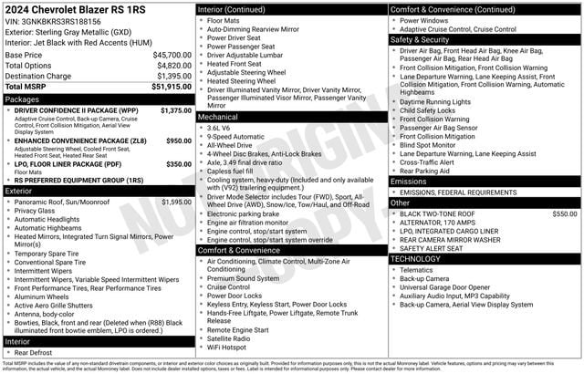 Adaptive Cruise Control, Driver Confidence II Package, Enhanced Automatic Emergency Braking, Enhanced Convenience Package, HD Surround Vision, Heated Rear Outboard Seating Positions, Memory Settings For Driver Seat & Exterior Mirrors, Navigation System, Power Tilt & Telescoping Steering Column, Rear Camera Mirror, Safety Alert Seat, Ventilated Driver & Front Passenger Seats, 1st & 2nd Row All-Weather Floor Liners (LPO), 3.49 Final Drive Axle Ratio, 4-Wheel Disc Brakes, 6-Way Power Front Passenger Seat Adjuster, 8 Speakers, 8-Way Power Driver Seat Adjuster, ABS brakes, Air Conditioning, Alloy wheels, AM/FM radio: SiriusXM with 360L, Apple CarPlay/Android Auto, Auto High-beam Headlights, Auto-dimming door mirrors, Auto-dimming Rear-View mirror, Automatic temperature control, Black 2-Tone Roof, Bose Premium 8-Speaker Audio System Feature, Brake assist, Bumpers: body-color, Child-Seat-Sensing Airbag, Compass, Delay-off headlights, Driver door bin, Driver vanity mirror, Dual front impact airbags, Dual front side impact airbags, Electronic Stability Control, Emergency communication system: OnStar and Chevrolet connected services capable, Floor Liner Package (LPO), Four wheel independent suspension, Front anti-roll bar, Front Bucket Seats, Front Center Armrest, Front dual zone A/C, Front reading lights, Fully automatic headlights, Garage door transmitter, Heated door mirrors, Heated Driver & Front Passenger Seats, Heated front seats, Heated Steering Wheel, Heated steering wheel, Illuminated entry, Integrated Cargo Liner (LPO), Knee airbag, Leather Shift Knob, Leather steering wheel, Low tire pressure warning, Occupant sensing airbag, Outside temperature display, Overhead airbag, Overhead console, Panic alarm, Passenger door bin, Passenger vanity mirror, Perforated Leather-Appointed Seat Trim, Power door mirrors, Power Driver Lumbar Control, Power driver seat, Power Liftgate, Power Panoramic Tilt-Sliding Sunroof, Power passenger seat, Power steering, Power windows, Preferred Equipment Group 1RS, Premium audio system: Chevrolet Infotainment 3 Premium, Radio data system, Radio: Chevrolet Infotainment 3 Premium System, Rear anti-roll bar, Rear Camera Mirror Washer, Rear reading lights, Rear seat center armrest, Rear window defroster, Rear window wiper, Remote keyless entry, Ride & Handling Suspension, Security system, SiriusXM w/360L, Speed control, Speed-sensing steering, Split folding rear seat, Spoiler, Steering wheel mounted audio controls, Tachometer, Telescoping steering wheel, Tilt steering wheel, Traction control, Trip computer, Turn signal indicator mirrors, Variably intermittent wipers, Voltmeter, Wheels: 20 Technical Gray Aluminum, Adaptive Cruise Control, Driver Confidence II Package, Enhanced Automatic Emergency Braking, Enhanced Convenience Package, HD Surround Vision, Heated Rear Outboard Seating Positions, Memory Settings For Driver Seat & Exterior Mirrors, Navigation System, Power Tilt & Telescoping Steering Column, Rear Camera Mirror, Safety Alert Seat, Ventilated Driver & Front Passenger Seats.