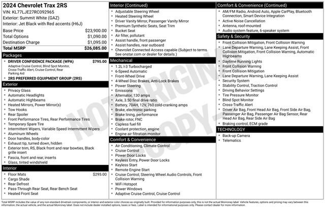 Adaptive Cruise Control, Driver Confidence Package, Lane Change Alert w/Side Blind Zone Alert, Rear Cross-Traffic Alert, Rear Park Assist, 2-Way Adjustable Front Head Restraints, 3.50 Final Drive Axle Ratio, 4-Way Manual Front Passenger Seat Adjuster, 4-Wheel Disc Brakes, 6 Speakers, 6-Speaker Audio System Feature, 6-Way Manual Driver Seat Adjuster, ABS brakes, Air Conditioning, Alloy wheels, AM/FM radio: SiriusXM, Auto High-beam Headlights, Automatic temperature control, Brake assist, Bumpers: body-color, Compass, Delay-off headlights, Driver door bin, Driver vanity mirror, Dual front impact airbags, Dual front side impact airbags, Electronic Stability Control, Emergency communication system: OnStar and Chevrolet connected services capable, Evotex Seat Trim, Exterior Parking Camera Rear, Front & Rear All-Weather Floor Liners (LPO), Front anti-roll bar, Front Bucket Seats, Front Center Armrest, Front reading lights, Front wheel independent suspension, Fully automatic headlights, Heated door mirrors, Heated Driver & Front Passenger Seats, Heated front seats, Heated steering wheel, Illuminated entry, Low tire pressure warning, Occupant sensing airbag, Outside temperature display, Overhead airbag, Overhead console, Panic alarm, Passenger door bin, Passenger vanity mirror, Power door mirrors, Power steering, Power windows, Preferred Equipment Group 2RS, Premium audio system: Chevrolet Infotainment 3, Radio data system, Radio: Audio System w/AM/FM, Rear Park Assist (DISC), Rear window defroster, Rear window wiper, Remote keyless entry, Security system, SiriusXM, Speed control, Split folding rear seat, Spoiler, Sport steering wheel, Steering wheel mounted audio controls, Tachometer, Telescoping steering wheel, Tilt steering wheel, Traction control, Trip computer, Variably intermittent wipers, Wheels: 19 Black-Painted Machined Aluminum, Adaptive Cruise Control, Driver Confidence Package, Lane Change Alert w/Side Blind Zone Alert, Rear Cross-Traffic Alert, Rear Park Assist.