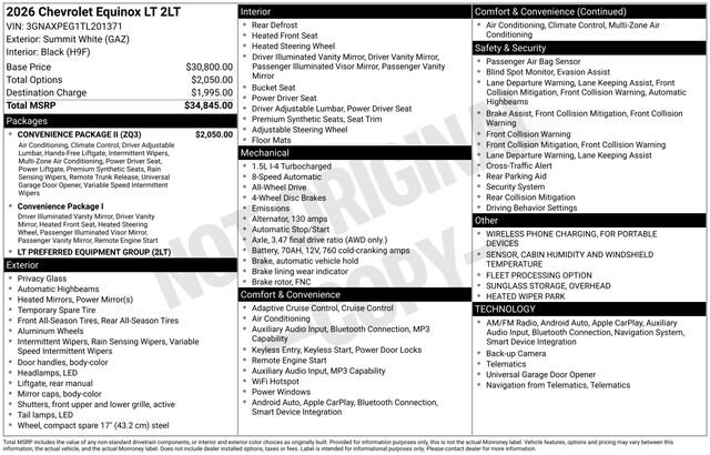 2-Way Power Driver Lumbar Control Seat Adjuster, Autosense Hands-Free Programmable Power Liftgate, Cabin Humidity and Windshield Sensor, Convenience Package II, Driver 8-Way Power Seat Adjuster, Dual-Zone Automatic Climate Control, Evotex Seat Trim, Heated Wiper Park, Intermittent Front Rain-Sensing Wipers, Navigation System, Overhead Sunglass Storage, Programmable Universal Home Remote, Wireless Phone Charging For Portable Devices, 3.47 Final Drive Axle Ratio, 4-Wheel Disc Brakes, 6 Speakers, ABS brakes, Air Conditioning, Alloy wheels, AM/FM radio: SiriusXM, Auto High-beam Headlights, Brake assist, Bumpers: body-color, Cloth Seat Trim, Compass, Delay-off headlights, Driver 6-Way Manual Seat Adjuster, Driver door bin, Driver vanity mirror, Dual front impact airbags, Dual front side impact airbags, Electronic Stability Control, Emergency communication system: OnStar and Chevrolet connected services capable, Four wheel independent suspension, Front anti-roll bar, Front Bucket Seats, Front Center Armrest, Front Passenger 4-Way Manual Seat Adjuster, Front reading lights, Fully automatic headlights, Heated door mirrors, Heated Driver and Front Passenger Seats, Heated front seats, Heated steering wheel, Illuminated entry, Low tire pressure warning, Occupant sensing airbag, Outside temperature display, Overhead airbag, Overhead console, Panic alarm, Passenger door bin, Passenger vanity mirror, Power door mirrors, Power steering, Power windows, Preferred Equipment Group 2LT, Premium audio system: Chevrolet Infotainment 3, Radio data system, Radio: 11.3 Diagonal Advanced Color LCD Display, Rear anti-roll bar, Rear reading lights, Rear seat center armrest, Rear window defroster, Rear window wiper, Remote keyless entry, Security system, SiriusXM with 360L Trial Subscription, Speed control, Speed-sensing steering, Split folding rear seat, Spoiler, Steering wheel mounted audio controls, Tachometer, Telescoping steering wheel, Tilt steering wheel, Traction control, Trip computer, Variably intermittent wipers, Wheels: 17 Grazen Metallic Machined-Face Aluminum, 2-Way Power Driver Lumbar Control Seat Adjuster, Autosense Hands-Free Programmable Power Liftgate, Cabin Humidity and Windshield Sensor, Convenience Package II, Driver 8-Way Power Seat Adjuster, Dual-Zone Automatic Climate Control, Evotex Seat Trim, Heated Wiper Park, Intermittent Front Rain-Sensing Wipers, Navigation System, Overhead Sunglass Storage, Programmable Universal Home Remote, Wireless Phone Charging For Portable Devices.