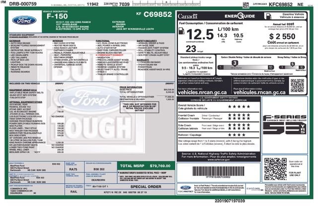 3.5L V6 ECOBOOST, 20 Machined-Aluminum Wheels, ABS brakes, Alloy wheels, AppLink/Apple CarPlay and Android Auto, BLIS Blind Spot Information System, Bright Belt Moldings, Chrome Door Handles w/Body-Color Strap, Chrome Front & Rear Bumpers, Chrome Skull Caps on Exterior Mirrors, Class IV Trailer Hitch Receiver, Compass, Electronic Locking w/3.55 Axle Ratio, Electronic Stability Control, Engine Oil Cooler, Equipment Group 601A Luxury, Extended Range 36 Gallon Fuel Tank, Exterior Parking Camera Rear, Front dual zone A/C, GVWR: 7,050 lbs Payload Package, Hard Folding Tonneau Box Cover (Dealer Installed), Heated door mirrors, Heated front seats, Heated rear seats, Heated steering wheel, Illuminated entry, Inflatable Rear Safety Belts, Integrated Trailer Brake Controller, King Ranch Chrome Appearance Package, King Ranch Leather Bucket Seats, Low tire pressure warning, Max Trailer Tow Package, Multi-Contour Driver & Passenger Seats, Navigation System, Power-Deployable Running Boards, Pro Trailer Backup Assist, Radio: B&O Sound System by Bang & Olufsen, Remote keyless entry, SiriusXM Radio, Speed control, SYNC 3, Tailgate Step w/Tailgate Lift Assist, Tilt steering wheel, Tough Bed Spray-In Bedliner, Traction control, Tray Style Floor Liner, Upgraded Front Stabilizer Bar, Voice-Activated Touchscreen Navigation, Wheel Well Liner, Wheels: 20 Chrome-Like PVD.