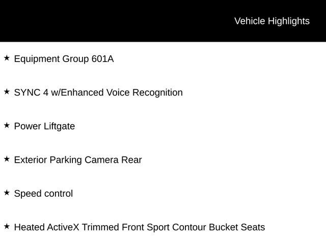 Equipment Group 601A, Exterior Parking Camera Rear, Heated ActiveX Trimmed Front Sport Contour Bucket Seats, Power Liftgate, Speed control, SYNC 4 w/Enhanced Voice Recognition, 2.91 Axle Ratio, 4-Wheel Disc Brakes, 6 Speakers, ABS brakes, Air Conditioning, Alloy wheels, AM/FM radio: SiriusXM, AM/FM Stereo, Auto High-beam Headlights, Auto-dimming Rear-View mirror, Automatic temperature control, Brake assist, Bumpers: body-color, Compass, Delay-off headlights, Driver door bin, Driver vanity mirror, Dual front impact airbags, Dual front side impact airbags, Electronic Fuel Door Release, Electronic Stability Control, Emergency communication system: SYNC 4 911 Assist, FordPass Connect, Four wheel independent suspension, Front anti-roll bar, Front Bucket Seats, Front Center Armrest, Front dual zone A/C, Front fog lights, Front reading lights, Fully automatic headlights, Garage door transmitter, Heated door mirrors, Heated front seats, Heated steering wheel, Illuminated entry, Knee airbag, Low tire pressure warning, Memory seat, Navigation system: Connected Navigation, Neutral Towing Capability, Occupant sensing airbag, Outside temperature display, Overhead airbag, Overhead console, Panic alarm, Passenger door bin, Passenger vanity mirror, Pedestrian Alert Sounder, Power door mirrors, Power driver seat, Power passenger seat, Power steering, Power windows, Radio data system, Rain sensing wipers, Rear anti-roll bar, Rear reading lights, Rear seat center armrest, Rear window defroster, Rear window wiper, Remote keyless entry, Security system, Speed-sensing steering, Speed-Sensitive Wipers, Split folding rear seat, Spoiler, Steering wheel mounted audio controls, Telescoping steering wheel, Tilt steering wheel, Traction control, Trip computer, Variably intermittent wipers, Wheels: 19 Machined-Face Aluminum, Equipment Group 601A, Exterior Parking Camera Rear, Heated ActiveX Trimmed Front Sport Contour Bucket Seats, Power Liftgate, Speed control, SYNC 4 w/Enhanced Voice Recognition.