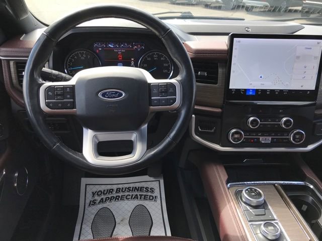 Navigation system: Connected Navigation, 12 Speakers, 3.31 Axle Ratio, 3rd row seats: split-bench, 4-Wheel Disc Brakes, ABS brakes, Adjustable pedals, Air Conditioning, Alloy wheels, AM/FM radio: SiriusXM with 360L, Auto High-beam Headlights, Auto-dimming door mirrors, Auto-dimming Rear-View mirror, Automatic temperature control, Brake assist, Bumpers: body-color, Compass, Delay-off headlights, Driver door bin, Driver vanity mirror, Dual front impact airbags, Dual front side impact airbags, Electronic Stability Control, Emergency communication system: SYNC 4 911 Assist, Exterior Parking Camera Rear, Four wheel independent suspension, Front anti-roll bar, Front Bucket Seats, Front Center Armrest, Front dual zone A/C, Front fog lights, Front reading lights, Fully automatic headlights, Garage door transmitter, Heated & Ventilated Leather Front Captain's Chairs, Heated door mirrors, Heated front seats, Heated rear seats, Heated steering wheel, Illuminated entry, Leather steering wheel, Low tire pressure warning, Memory seat, Occupant sensing airbag, Outside temperature display, Overhead airbag, Overhead console, Panic alarm, Passenger door bin, Passenger vanity mirror, Pedal memory, Power door mirrors, Power driver seat, Power Liftgate, Power moonroof, Power passenger seat, Power steering, Power windows, Radio data system, Radio: B&O Sound System by Bang & Olufsen, Rain sensing wipers, Rear air conditioning, Rear anti-roll bar, Rear reading lights, Rear window defroster, Rear window wiper, Reclining 3rd row seat, Remote keyless entry, Security system, SiriusXM w/360L, Speed control, Speed-sensing steering, Speed-Sensitive Wipers, Split folding rear seat, Spoiler, Steering wheel memory, Steering wheel mounted audio controls, SYNC 4 w/Enhanced Voice Recognition, Tachometer, Telescoping steering wheel, Tilt steering wheel, Traction control, Trip computer, Turn signal indicator mirrors, Variably intermittent wipers, Ventilated front seats, Voltmeter, Wheels: 20 Bright Machined Aluminum, Navigation system: Connected Navigation.