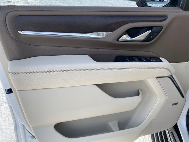 The exterior of this Yukon XL Denali is a head-turner, dressed in a sleek White Frost Tricoat finish that exudes elegance. The 22-inch bright machined aluminum wheels with premium paint add a touch of sophistication, while the power-retractable assist steps make entry and exit a breeze. The panoramic dual-pane sunroof opens up the cabin, allowing natural light to flood the interior and create a truly airy and spacious atmosphere.