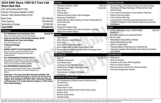 Includes a standard 6-month, 6,000-mile (whichever comes first) limited bumper-to-bumper warranty. If the vehicle has remaining new vehicle bumper-to-bumper limited warranty coverage, the CarBravo warranty coverage applies after expiration of the original new vehicle limited bumper-to-bumper warranty. If the vehicleâs original new vehicle limited bumper-to-bumper warranty has expired due to time or mileage, the CarBravo warranty coverage becomes effective on the day of the sale of the CarBravo vehicle.This 2024 GMC Sierra 1500 SLT is packed with an impressive array of features that are sure to elevate your driving experience. Highlights include: SLT PREMIUM PLUS PACKAGE 6.2L V8 EcoTec3 Engine Hard-Folding Tonneau Cover Downpour Metallic Blue Exterior Dual, Sport-Mode Enabled Active ExhaustThis Sierra 1500 also comes equipped with the ProGrade Trailering System, Sierra Safety Plus Package, SLT Convenience Package, and SLT Preferred Package, providing you with a comprehensive suite of advanced safety and convenience technologies. Standout features include the Navigation System, Premium Bose 7-Speaker Sound System, Adaptive Cruise Control, and Wireless Charging, among many others.This vehicle has been carefully inspected and certified to meet our high standards. With just 32,963 miles on the odometer, this Sierra 1500 SLT is ready to provide you with years of reliable, capable, and comfortable performance.Imagine yourself behind the wheel of this impressive truck, with its powerful EcoTec3 V8 engine and advanced 4WD system. The Sierra 1500 SLT offers an exceptional blend of capability, technology, and style, making it the perfect choice for those who demand the very best from their full-size pickup.Whether you're hauling heavy loads, towing a trailer, or simply enjoying the open road, this 2024 GMC Sierra 1500 SLT is ready to exceed your expectations. We invite you to visit our showroom and experience the difference for yourself. Let us demonstrate how this exceptional vehicle can enhance your driving lifestyle and become an integral part of your daily routine.Take the next step and schedule a test drive today. We're confident you'll be impressed by the Sierra 1500 SLT's impressive capabilities, refined interior, and exceptional value. Let us show you why this truck is the perfect choice for your next adventure.
