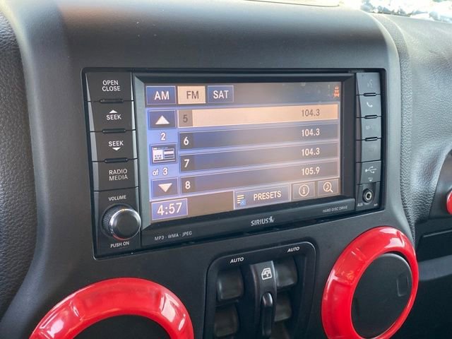 17 x 7.5 Polished Mineral Gray Wheels, 3.73 Rear Axle Ratio, 4-Wheel Disc Brakes, 40GB Hard Drive w/20GB Available, 5-Year SIRIUSXM Traffic Service, 5-Year SIRIUSXM Travel Link Service, 8 Speakers, ABS brakes, Accent Stitching, Air Conditioning, Air Conditioning w/Auto Temperature Control, Air Filtering, Alloy wheels, Alpine 9-Speaker w/All Weather Subwoofer, AM/FM radio, Audio Jack Input for Mobile Devices, Auto-dimming Rear-View mirror, Black 3-Piece Hard Top, Black/Chrome Screws Fuel Filler Door, Brake assist, CD player, Chrome/Leather Wrapped Shift Knob, Cloth Bucket Seats, Compass, Connectivity Group, Delete Sunrider Soft Top, Driver door bin, Driver Height Adjuster Seat, Driver vanity mirror, Dual front impact airbags, Electronic Stability Control, Freedom Panel Storage Bag, Front anti-roll bar, Front Bucket Seats, Front Center Armrest w/Storage, Front fog lights, Front reading lights, Front Seat Back Map Pockets, Fully automatic headlights, Heated door mirrors, Heated Front Seats, Hood w/Power Dome, Humidity Sensor, Illuminated entry, Integrated roll-over protection, Integrated Voice Command w/Bluetooth, Leather steering wheel, Leather Trimmed Bucket Seats, Leather Wrapped Steering Wheel, Low Gloss Black Wrangler Decal, Low tire pressure warning, MOPAR Dealer Installed Tow Strap Kit, MOPAR Slush Mats, Occupant sensing airbag, Outside temperature display, Panic alarm, Passenger door bin, Passenger vanity mirror, Performance Suspension, Power door mirrors, Power steering, Power windows, Premium Black Sunrider Soft Top, Premium EVIC Message Center, Quick Order Package 24J Rubicon Hard Rock, Radio data system, Radio: Uconnect 130 AM/FM/CD/MP3, Radio: Uconnect 730N CD/DVD/MP3/HDD/NAV, Rear anti-roll bar, Rear Window Defroster, Rear Window Wiper/Washer, Red Front & Rear Tow Hooks, Red Trail Rated Badge, Remote keyless entry, Remote Start System, Remote USB Port, Rubicon Hard Rock Package, Rubicon Hood Decal, Security system, Silver Interior Accents, SIRIUSXM Traffic, SIRIUSXM Travel Link, Speed control, Split folding rear seat, Steel Front Bumper, Steel Rear Bumper, Steering wheel mounted audio controls, Sunrider Soft Top, Supplemental Front Seat Side Airbags, Tachometer, Tilt steering wheel, Tire Pressure Monitoring Display, Traction control, Trip computer, Uconnect Voice Command w/Bluetooth, Variably intermittent wipers, Vehicle Information Center, Wheels: 17 x 7.5 Polished Semi-Gloss Black.