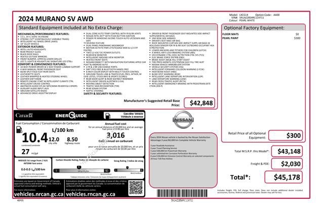 AM/FM/CD/MP3/WMA Audio System, NissanConnect featuring Apple CarPlay and Android Auto, Speed control, 4-Wheel Disc Brakes, 4.667 Axle Ratio, 6 Speakers, ABS brakes, Air Conditioning, Alloy wheels, AM/FM radio: SiriusXM, Auto High-beam Headlights, Auto-dimming Rear-View mirror, Automatic temperature control, Blind Spot Warning, Brake assist, Bumpers: body-color, CD player, Child-Seat-Sensing Airbag, Compass, Delay-off headlights, Driver door bin, Driver vanity mirror, Dual front impact airbags, Dual front side impact airbags, Electronic Stability Control, Four wheel independent suspension, Front anti-roll bar, Front Bucket Seats, Front Center Armrest, Front dual zone A/C, Front fog lights, Front reading lights, Fully automatic headlights, Heated door mirrors, Heated Front Bucket Seats, Heated front seats, Illuminated entry, Knee airbag, Leather steering wheel, Leatherette-Appointed Seat Trim, Low tire pressure warning, Occupant sensing airbag, Outside temperature display, Overhead airbag, Overhead console, Panic alarm, Passenger door bin, Passenger vanity mirror, Power door mirrors, Power driver seat, Power passenger seat, Power steering, Power windows, Radio data system, Rear anti-roll bar, Rear reading lights, Rear seat center armrest, Rear side impact airbag, Rear window defroster, Rear window wiper, Remote keyless entry, Security system, Speed-sensing steering, Speed-Sensitive Wipers, Split folding rear seat, Spoiler, Steering wheel mounted audio controls, Tachometer, Telescoping steering wheel, Tilt steering wheel, Traction control, Trip computer, Turn signal indicator mirrors, Variably intermittent wipers, Wheels: 18 Machined Aluminum-Alloy, ALL WHEEL DRIVE, AM/FM/CD/MP3/WMA Audio System, NissanConnect featuring Apple CarPlay and Android Auto, Speed control.