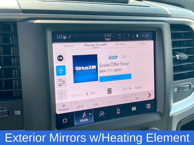 2nd Row In Floor Storage Bins, Auto-Dimming Exterior Mirrors, Auto-Dimming Rear-View Mirror, Black Exterior Mirrors, Cluster 7.0 TFT Color Display, Exterior Mirrors Courtesy Lamps, Exterior Mirrors w/Heating Element, Exterior Mirrors w/Supplemental Signals, Glove Box Lamp, Heated Front Seats, Heated Seats & Wheel Group, Heated Steering Wheel, Humidity Sensor, Leather Wrapped Steering Wheel, LED Bed Lighting, Luxury Group, Overhead Console w/Garage Door Opener, Power Heated Fold-Away Mirrors, Power-Folding Mirrors, Rear Dome w/On/Off Switch Lamp, Steering Wheel Mounted Audio Controls, Sun Visors w/Illuminated Vanity Mirrors, Universal Garage Door Opener, 3.21 Rear Axle Ratio, 4-Wheel Disc Brakes, 40/20/40 Split Bench Seat, 6 Speakers, 8.4 Touchscreen Display, ABS brakes, Active Grille Shutters, Air Conditioning, Air Conditioning ATC w/Dual Zone Control, Alloy wheels, AM/FM radio: SiriusXM, Audio Input Jack for Mobile Devices, Brake assist, Bumpers: chrome, Center Hub, Class IV Receiver Hitch, Cloth 40/20/40 Bench Seat, Compass, Delay-off headlights, Driver door bin, Dual front impact airbags, Dual front side impact airbags, Electronic Shift, Electronic Stability Control, Electronics Group, Engine Calibration Flash, V2, Front anti-roll bar, Front Armrest w/3 Cupholders, Front Center Armrest w/Storage, Front License Plate Bracket, Front reading lights, Front wheel independent suspension, Fully automatic headlights, Global Telematics Box Module (TBM), GPS Antenna Input, Heated door mirrors, Illuminated entry, Integrated Center Stack Radio, Integrated Voice Command w/Bluetooth, Low tire pressure warning, Media Hub (2 USB, AUX), Occupant sensing airbag, Outside temperature display, Overhead airbag, Overhead console, Panic alarm, ParkSense Rear Park Assist System, ParkView Rear Back-Up Camera, Passenger door bin, Passenger vanity mirror, Power door mirrors, Power steering, Power windows, Protection Group, Radio data system, Radio: Uconnect 3 w/5 Display, Radio: Uconnect 5 W w/8.4 Display, Rear anti-roll bar, Rear Power Sliding Window, Rear seat center armrest, Rear step bumper, Rear Window Defroster, Remote keyless entry, Remote Start & Security Alarm Group, Remote USB Port, Remote USB Port - Charge Only, Rotary Shifter-Black, Security Alarm, SiriusXM Guardian - Included Trial (B), Speed control, Storage Tray, Tachometer, Tilt steering wheel, Tip Start, Tow Hooks, Traction control, Tri-Fold Tonneau Cover, Trip computer, USB Host Flip, Variably intermittent wipers, Voltmeter, 2nd Row In Floor Storage Bins, Auto-Dimming Exterior Mirrors, Auto-Dimming Rear-View Mirror, Black Exterior Mirrors, Cluster 7.0 TFT Color Display, Exterior Mirrors Courtesy Lamps, Exterior Mirrors w/Heating Element, Exterior Mirrors w/Supplemental Signals, Glove Box Lamp, Heated Front Seats, Heated Seats & Wheel Group, Heated Steering Wheel, Humidity Sensor, Leather Wrapped Steering Wheel, LED Bed Lighting, Luxury Group, Overhead Console w/Garage Door Opener, Power Heated Fold-Away Mirrors, Power-Folding Mirrors, Rear Dome w/On/Off Switch Lamp, Steering Wheel Mounted Audio Controls, Sun Visors w/Illuminated Vanity Mirrors, Universal Garage Door Opener.
